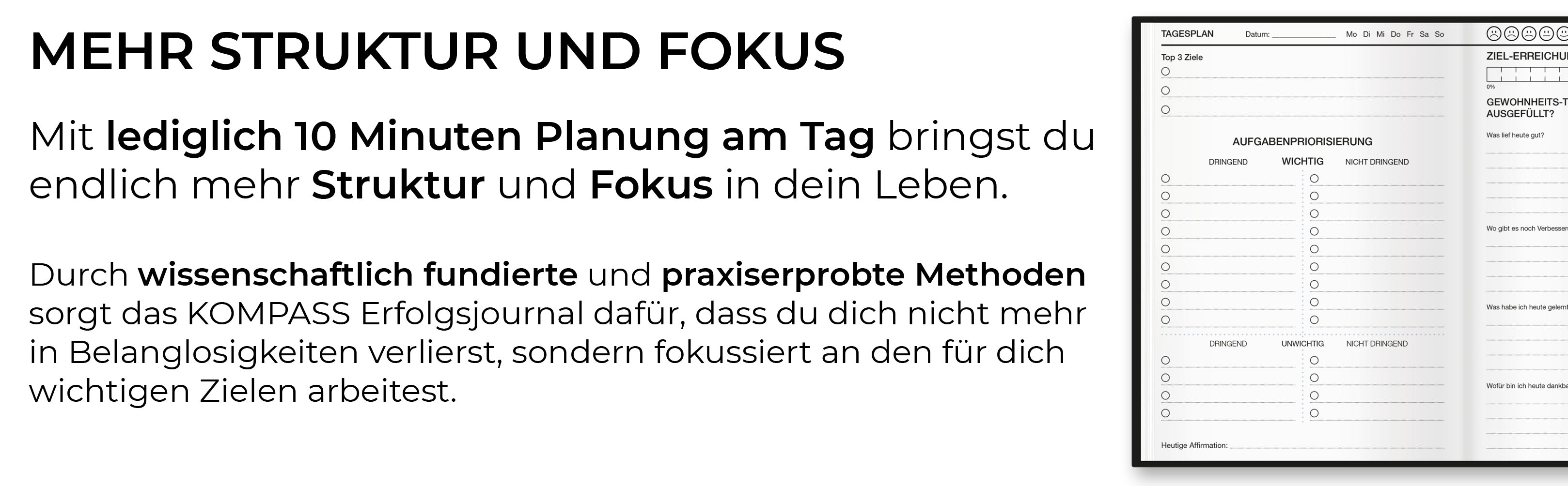 Ein produktiver Tag beginnt mit einem Plan. Unser Journal hilft dir dabei, tägliche, wöchentliche und monatliche Aufgaben zu organisieren und das Wichtigste zuerst zu erledigen.
