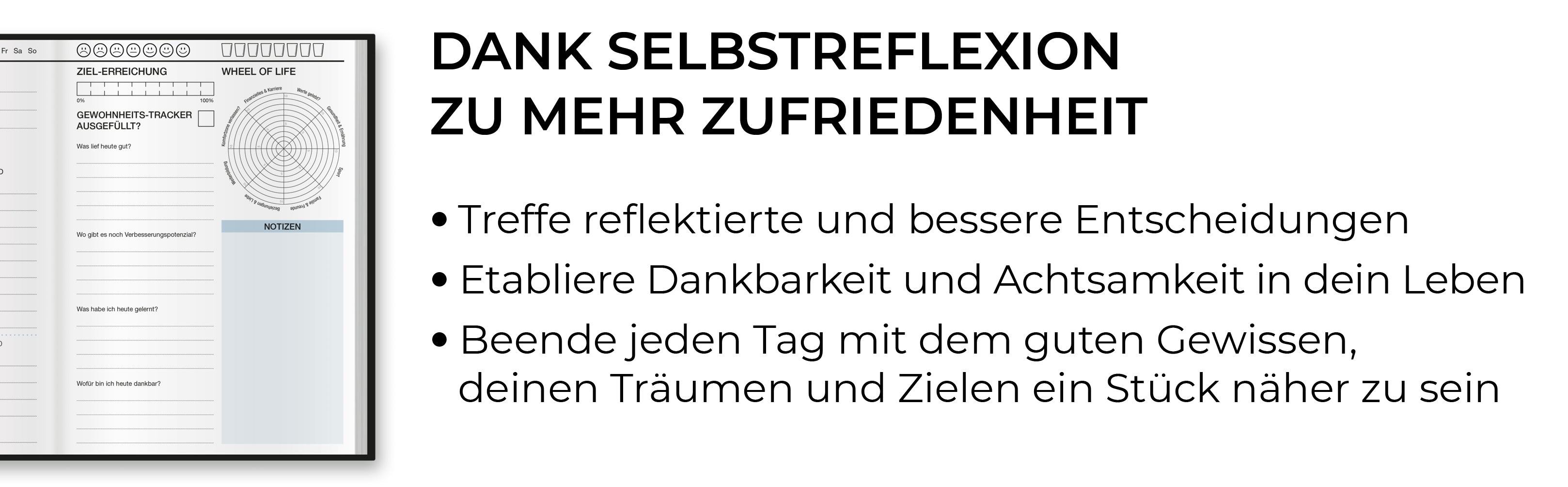 Starte jeden Tag mit einer klaren Vorstellung davon, wo du hinwillst. Mit dem Journal behältst du sowohl kurz- als auch langfristige Ziele stets vor Augen und bleibst fokussiert auf deinen Weg.