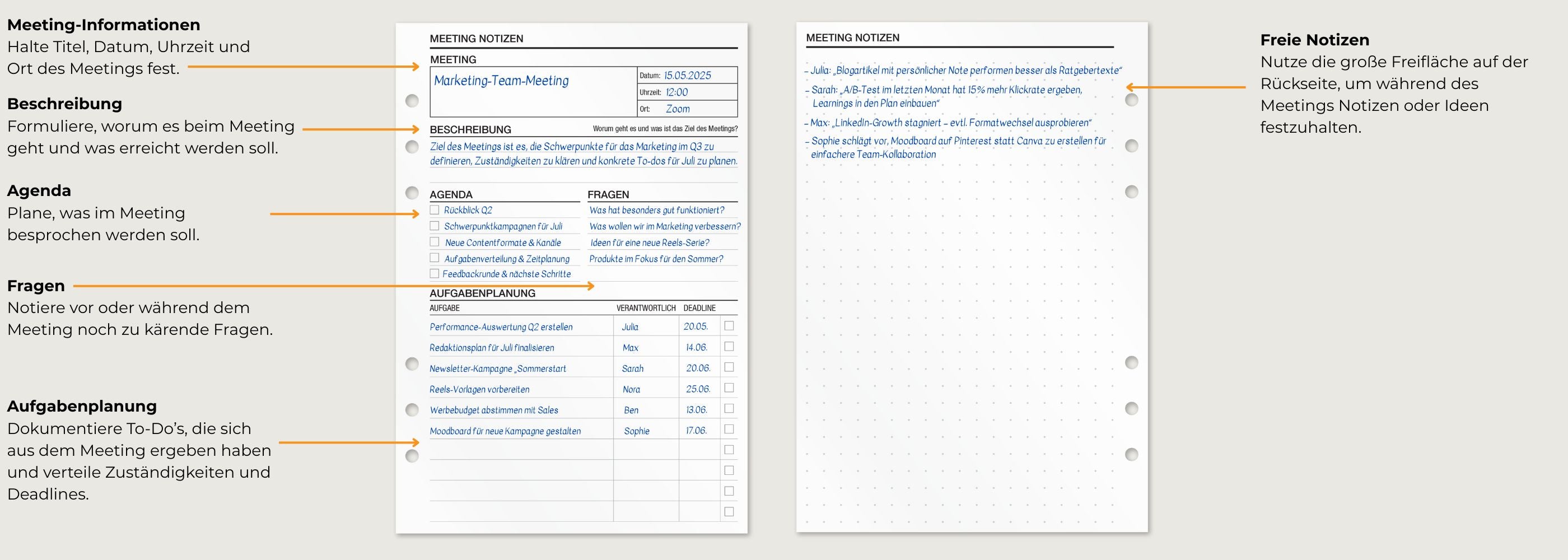Verwandle jedes Meeting in einen Erfolg. Die KOMPASS Meeting Notizen-Einlagen helfen dir, Meetings vorzubereiten und alle wichtigen Details und To-Dos übersichtlich festzuhalten.