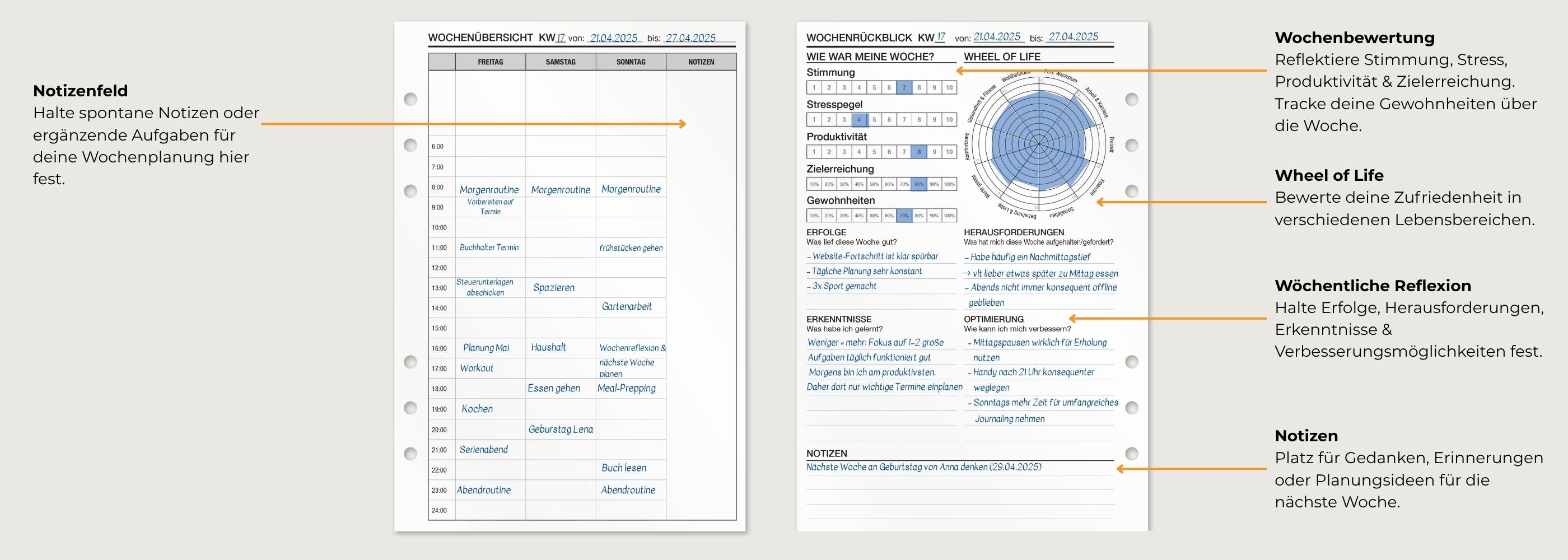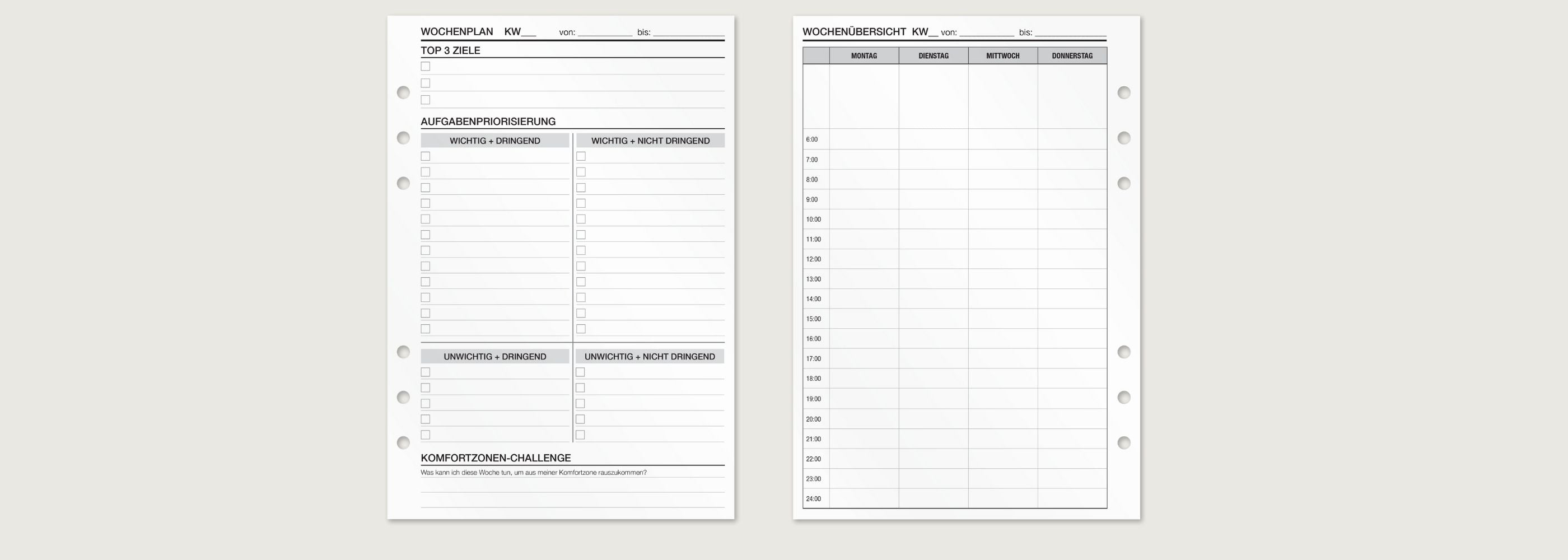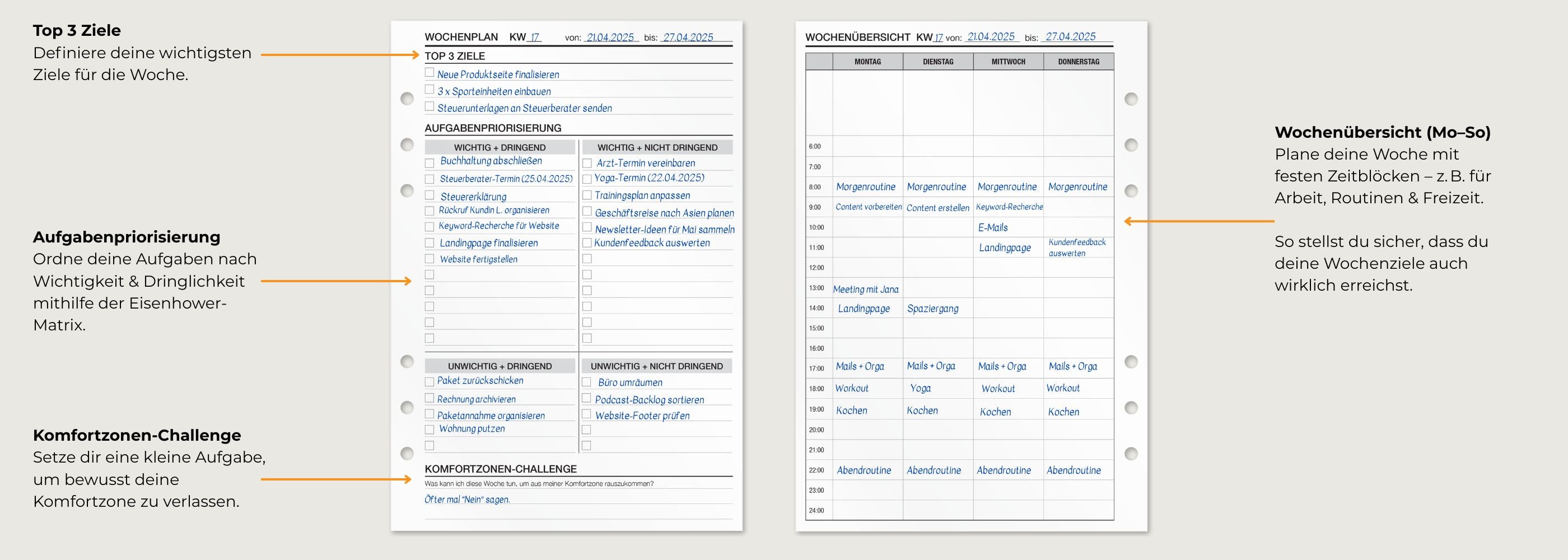 Organisiere deine Woche mit den KOMPASS Wochenplanung-Einlagen. Setze klare Prioritäten, behalte alle Aufgaben im Blick und reflektiere deine Fortschritte. Perfekt für alle, die produktiv und strukturiert durch die Woche gehen möchten.