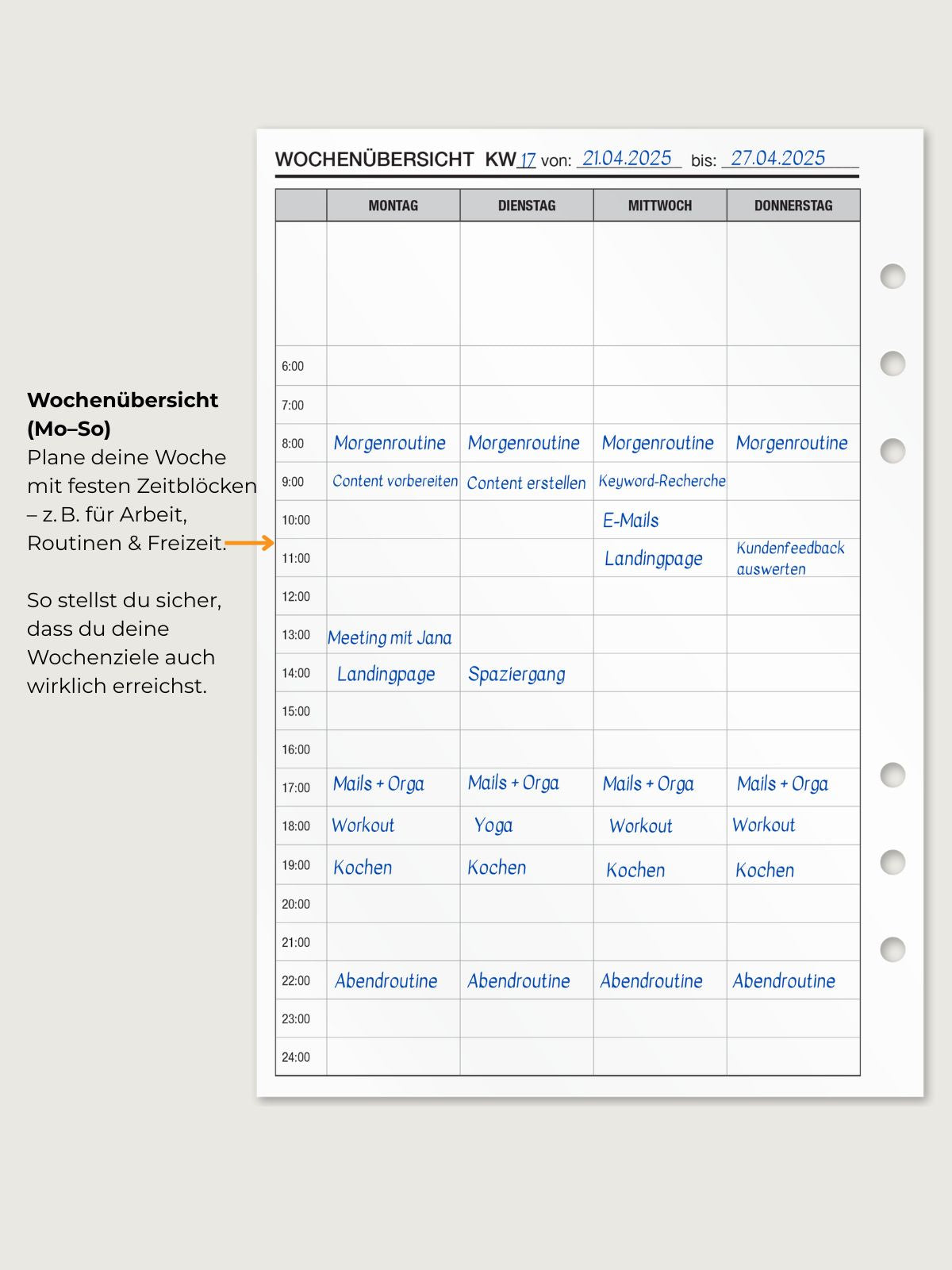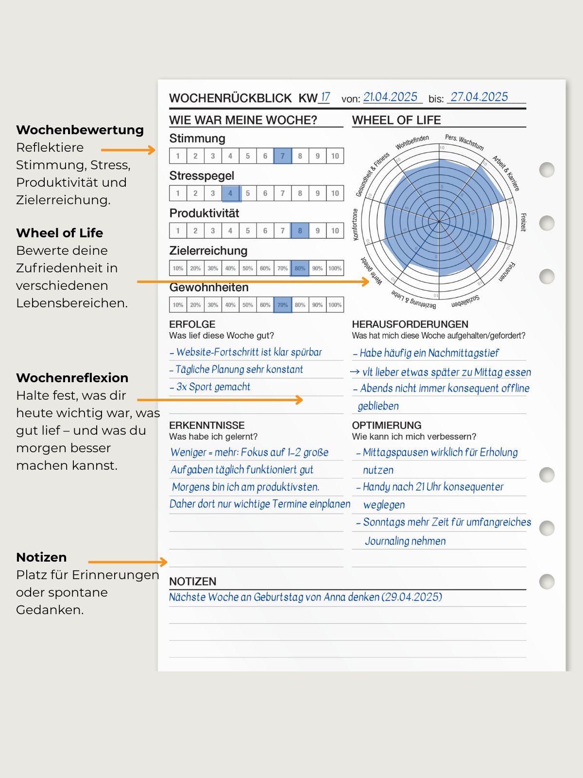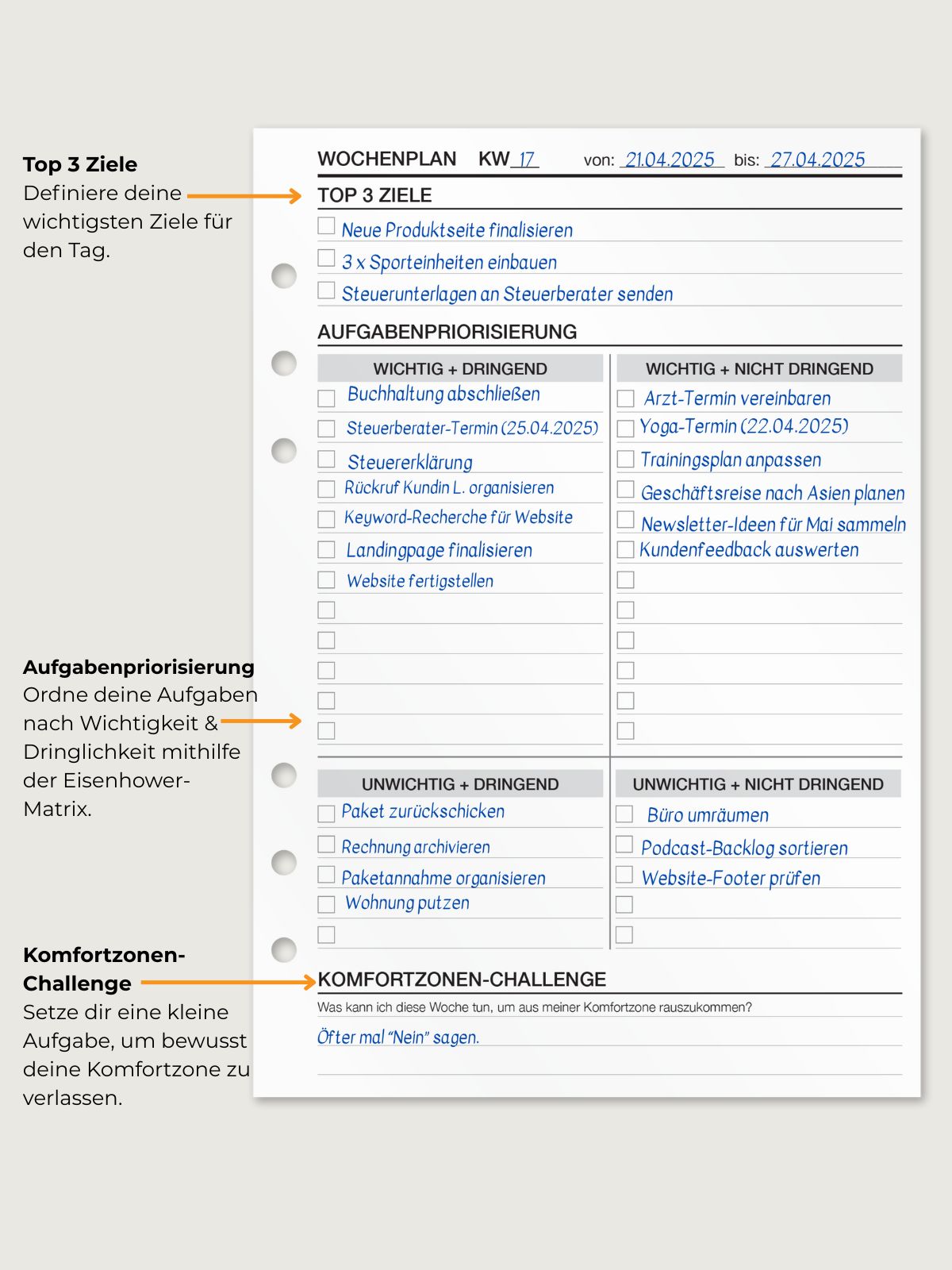 Organisiere deine Woche mit den KOMPASS Wochenplanung-Einlagen. Setze klare Prioritäten, behalte alle Aufgaben im Blick und reflektiere deine Fortschritte. Perfekt für alle, die produktiv und strukturiert durch die Woche gehen möchten.