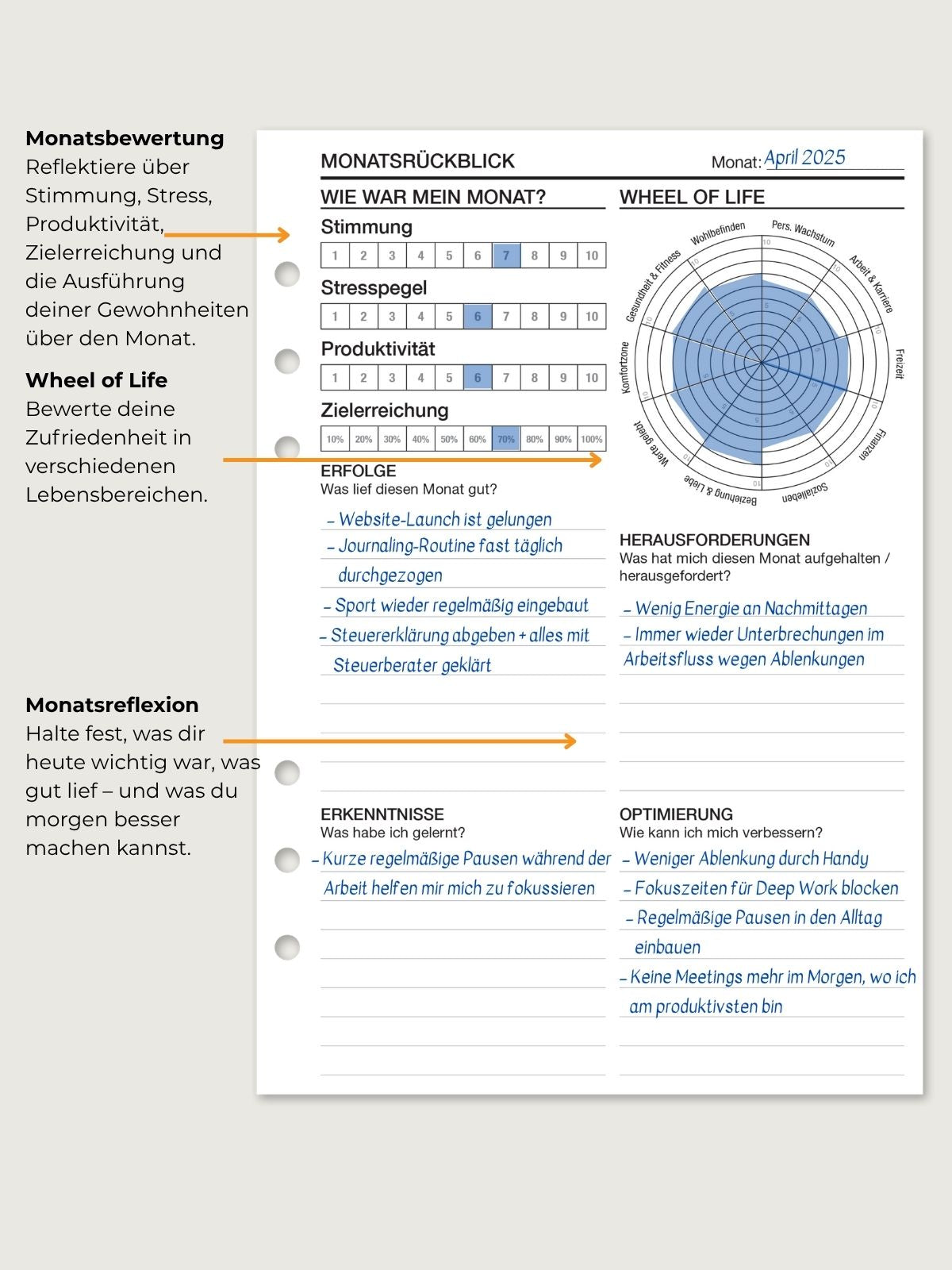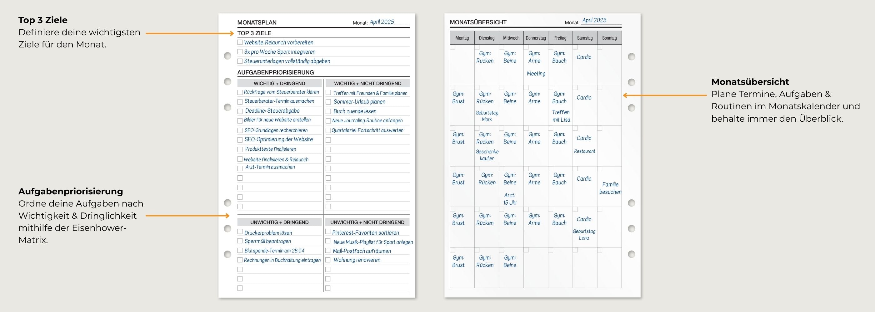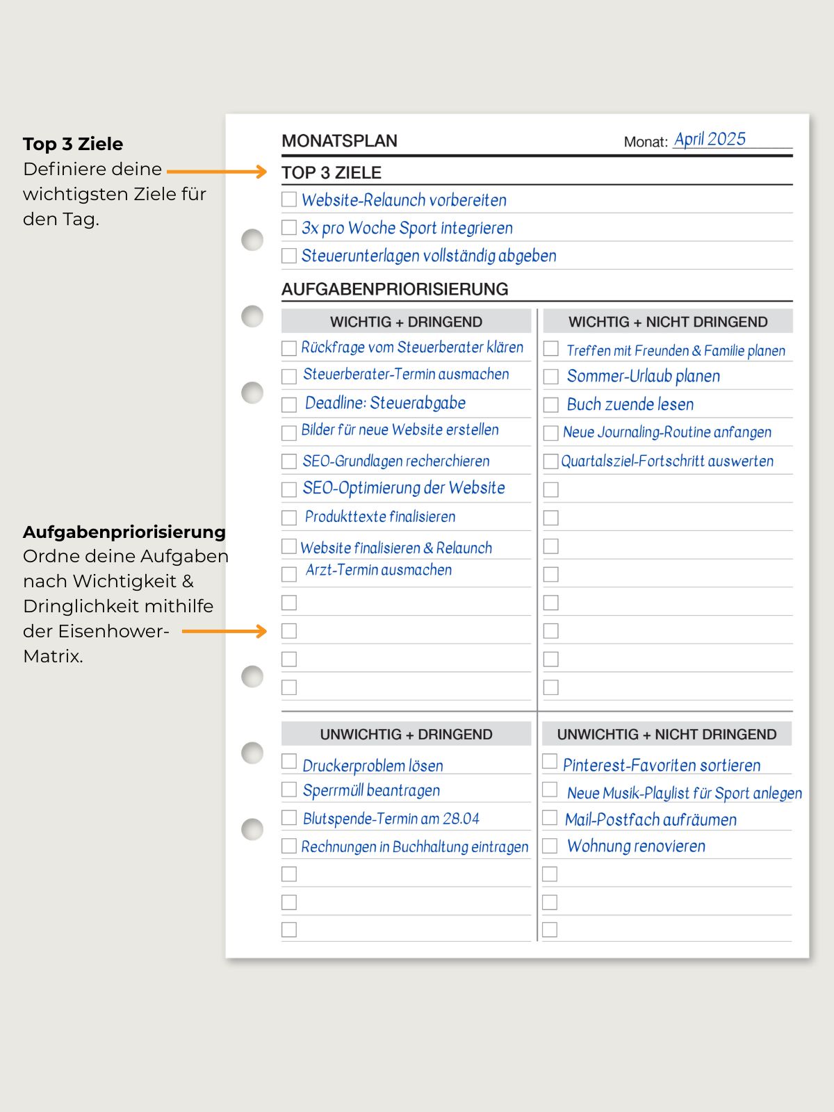 Strukturiere deinen Monat mit den KOMPASS Monatsplanung-Einlagen. Setze klare Prioritäten, reflektiere deine Erfolge und behalte wichtige Deadlines & Termine im Blick. Perfekt für alle, die organisiert und zielorientiert arbeiten möchten.