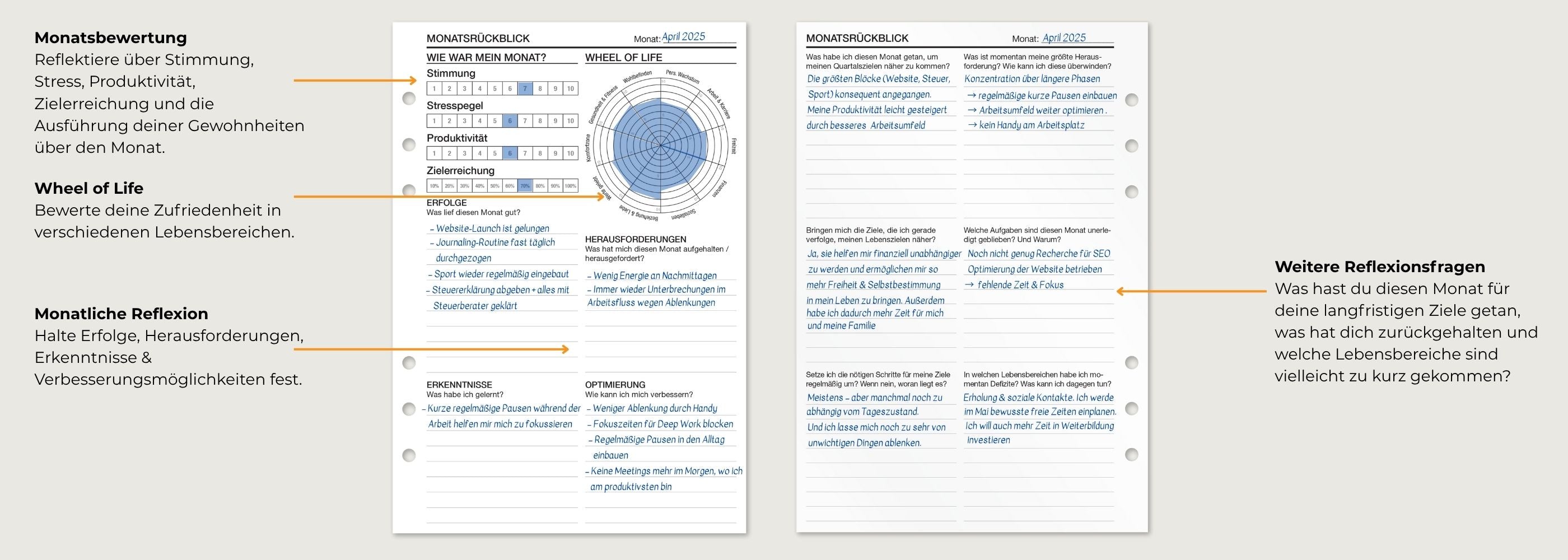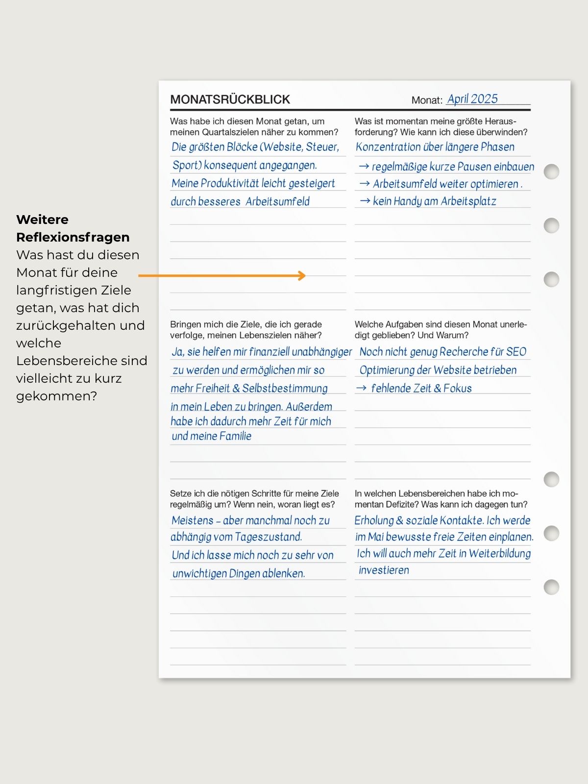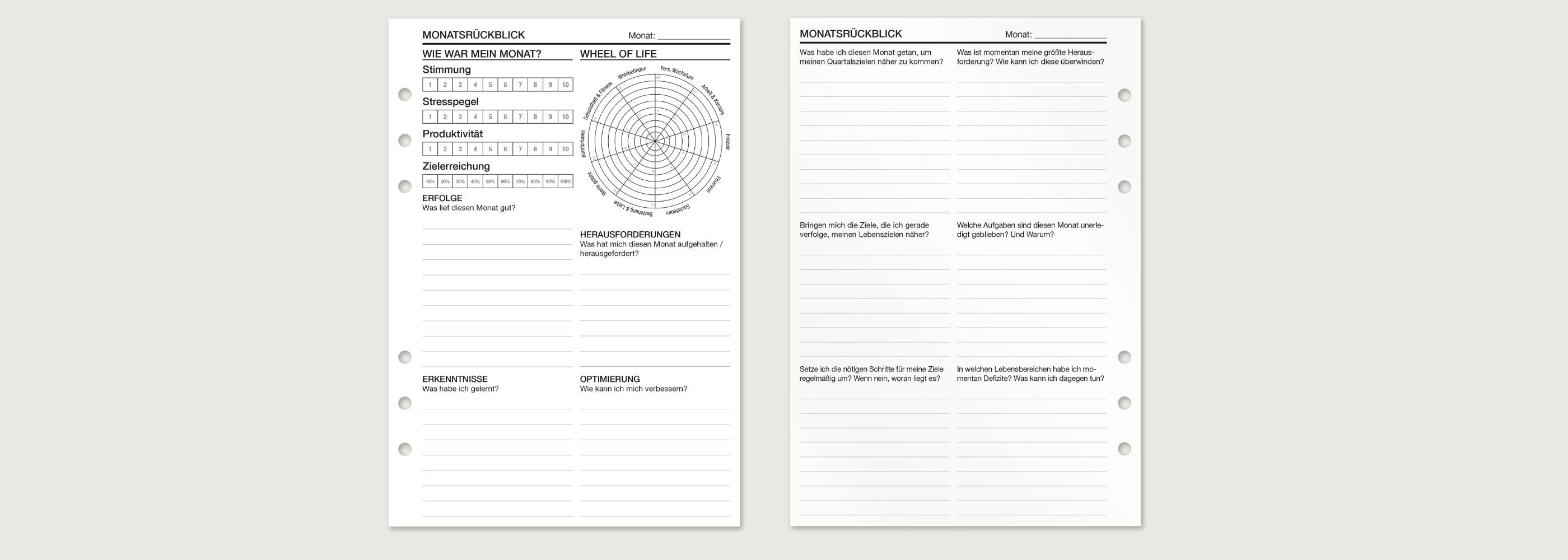Strukturiere deinen Monat mit den KOMPASS Monatsplanung-Einlagen. Setze klare Prioritäten, reflektiere deine Erfolge und behalte wichtige Deadlines & Termine im Blick. Perfekt für alle, die organisiert und zielorientiert arbeiten möchten.