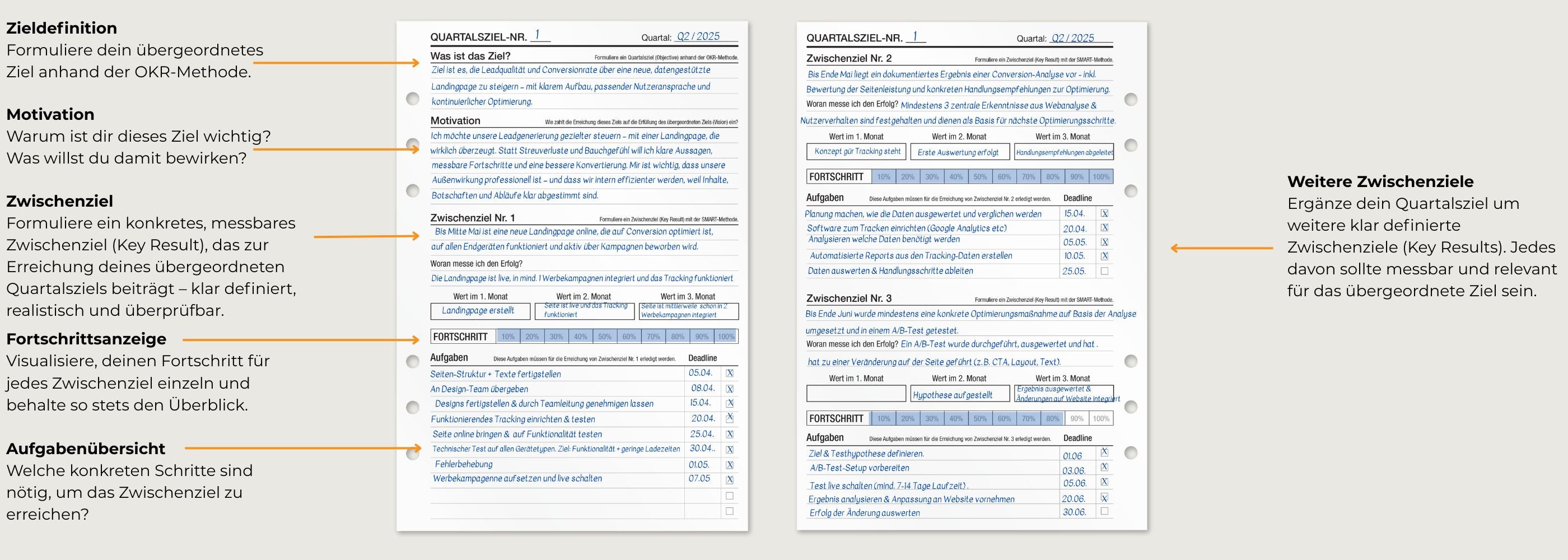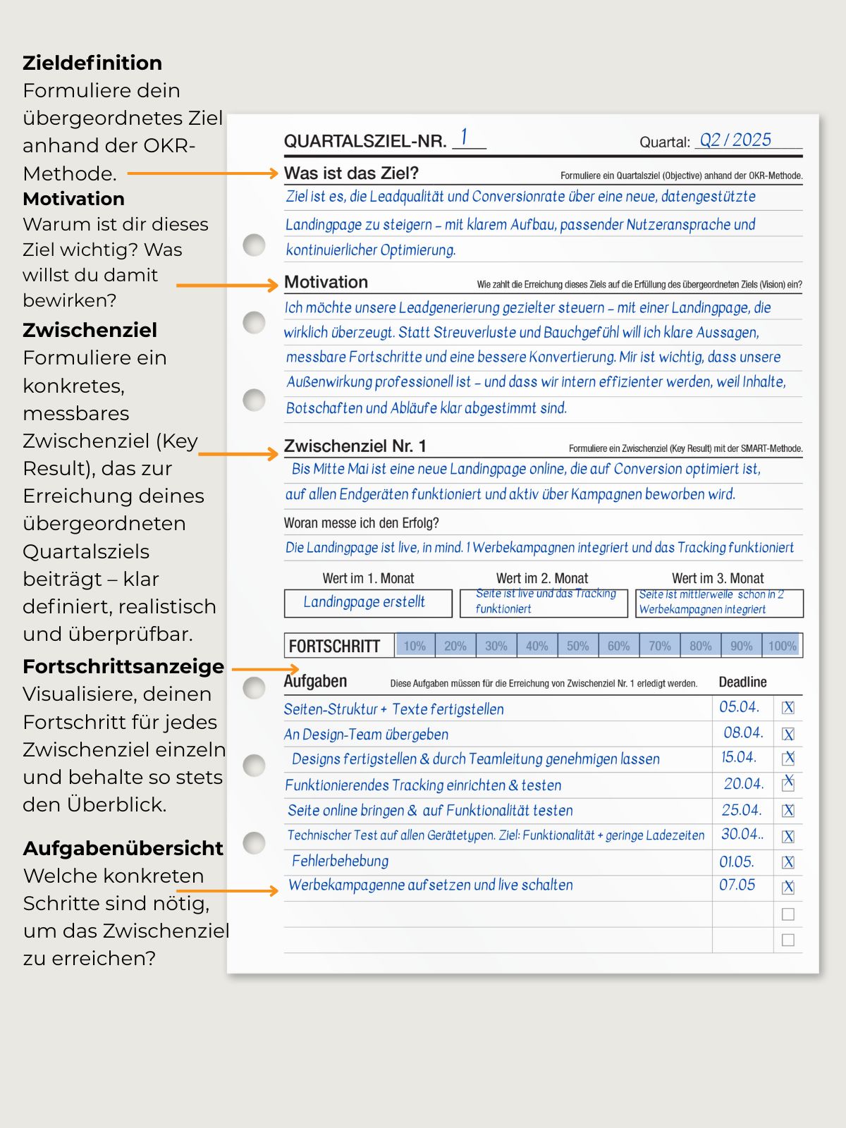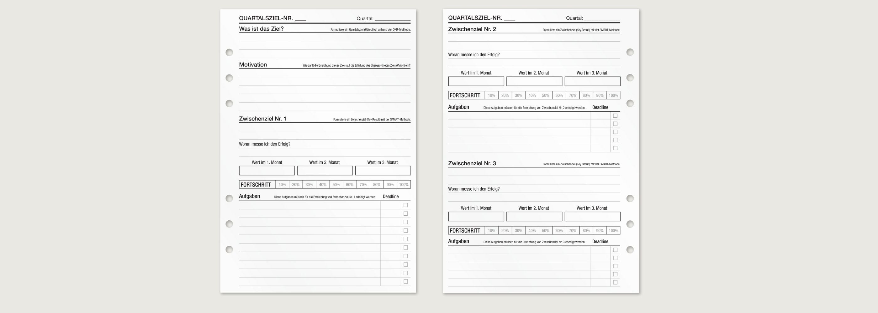 Die KOMPASS Quartalszieleinlagen basieren auf der OKR-Methode und bieten dir eine strukturierte Möglichkeit, ambitionierte Ziele zu setzen und messbare Ergebnisse zu verfolgen. Perfekt, um große Ziele in greifbare Schritte herunterzubrechen.
