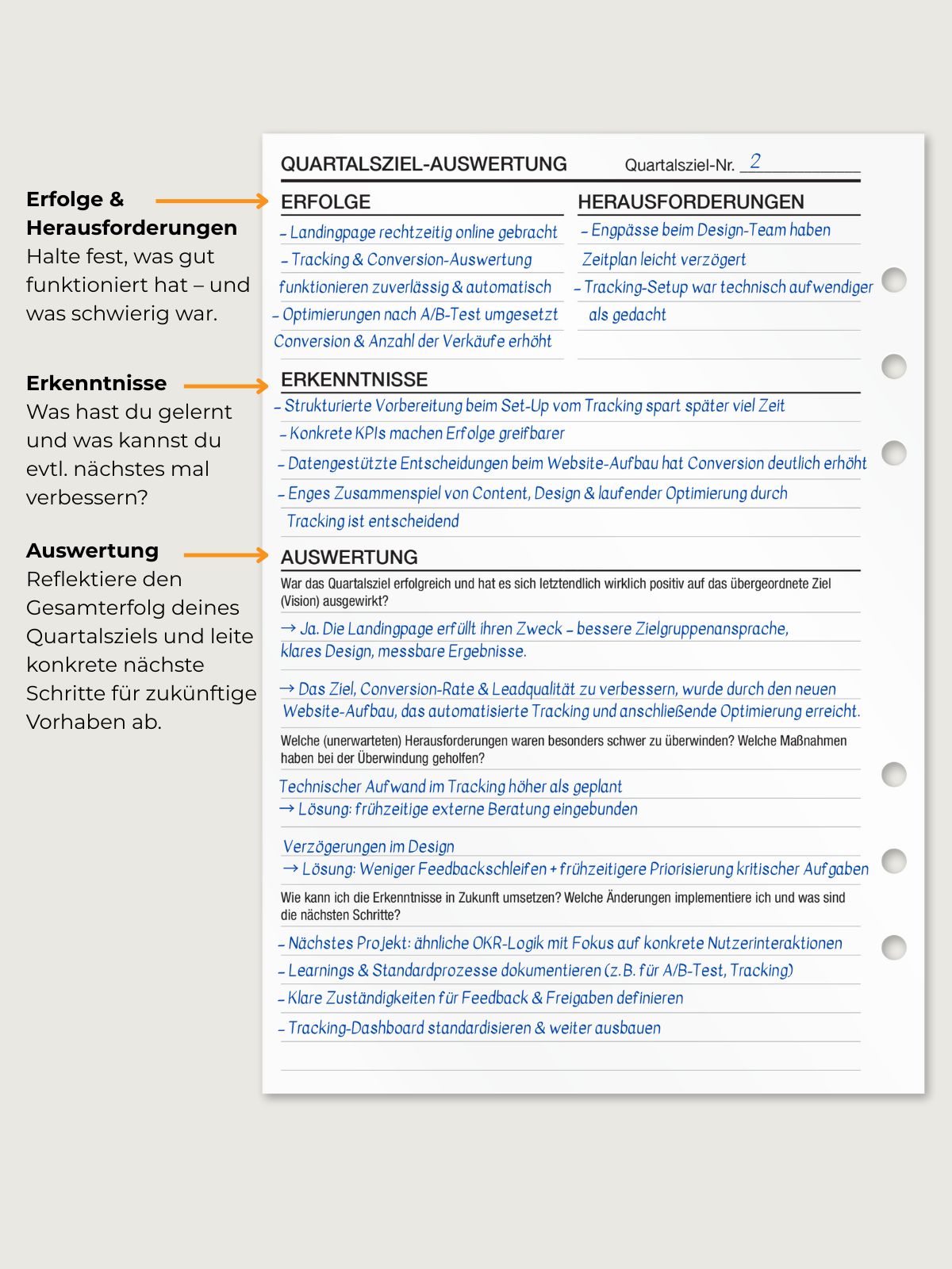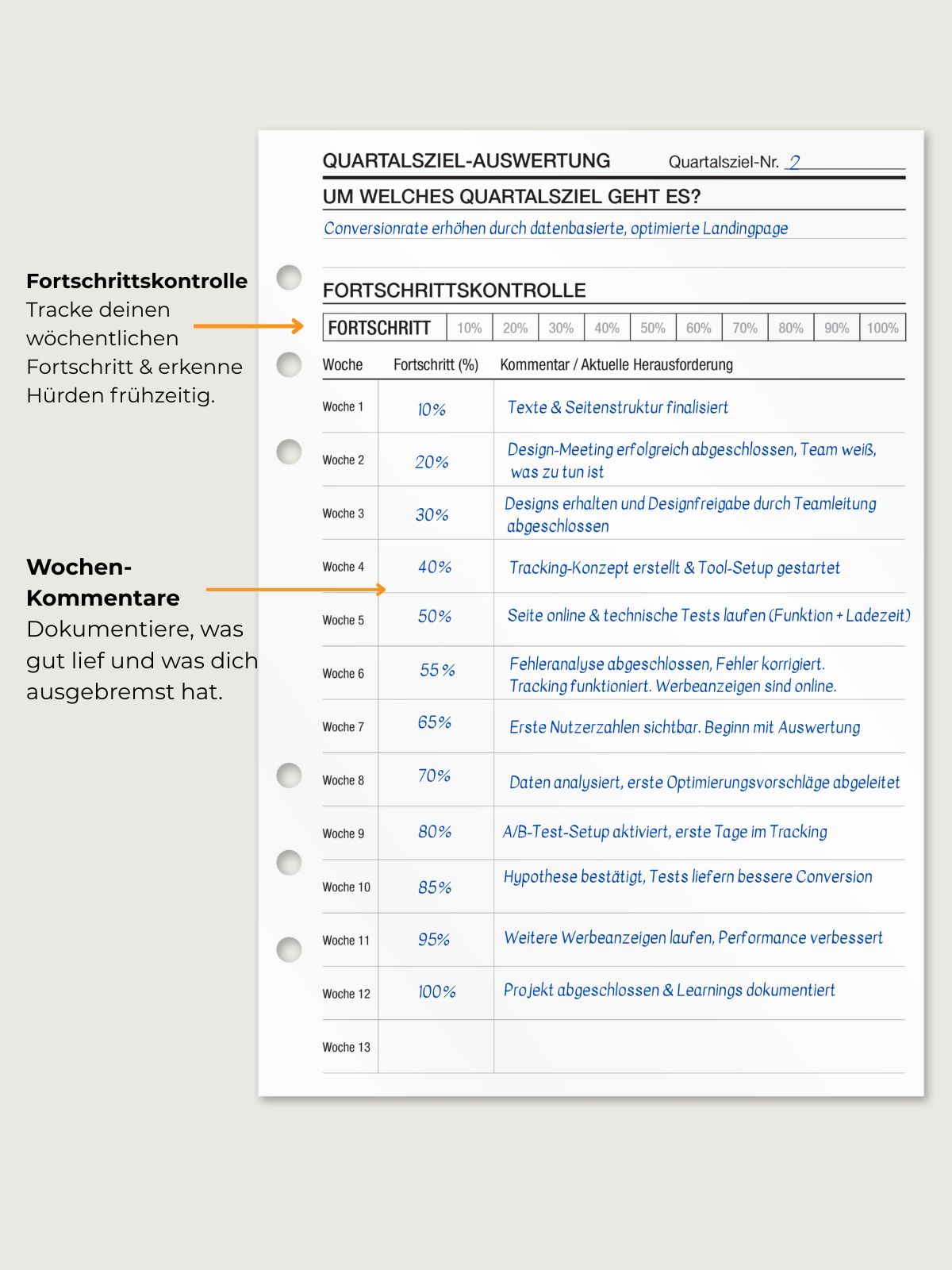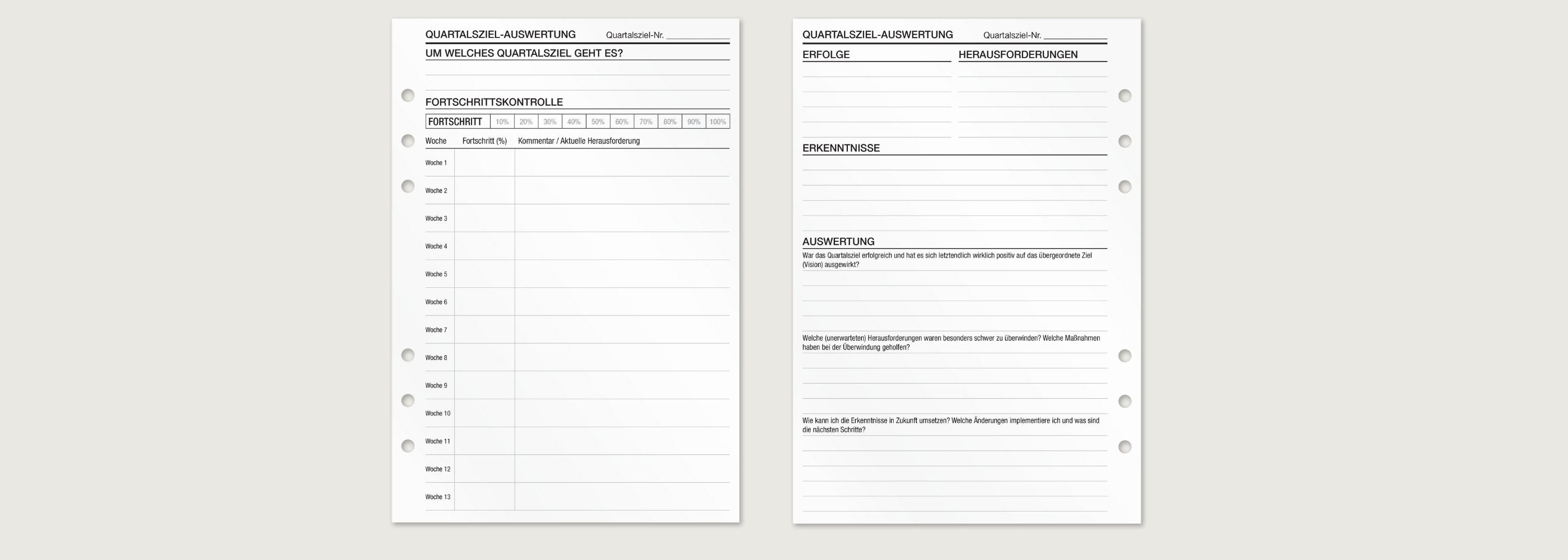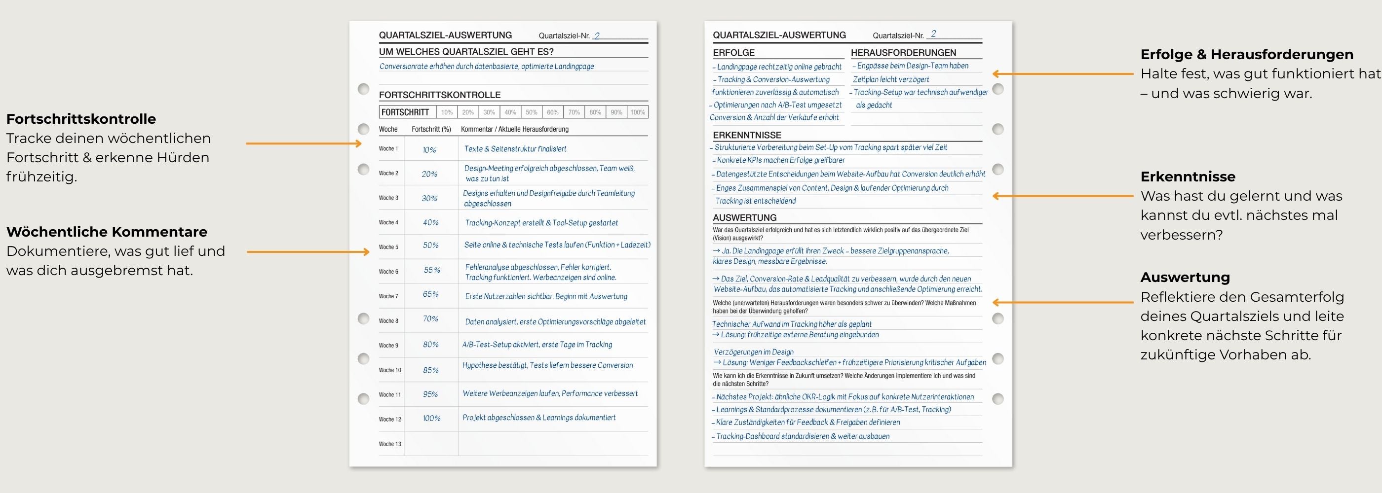 Die KOMPASS Quartalszieleinlagen basieren auf der OKR-Methode und bieten dir eine strukturierte Möglichkeit, ambitionierte Ziele zu setzen und messbare Ergebnisse zu verfolgen. Perfekt, um große Ziele in greifbare Schritte herunterzubrechen.