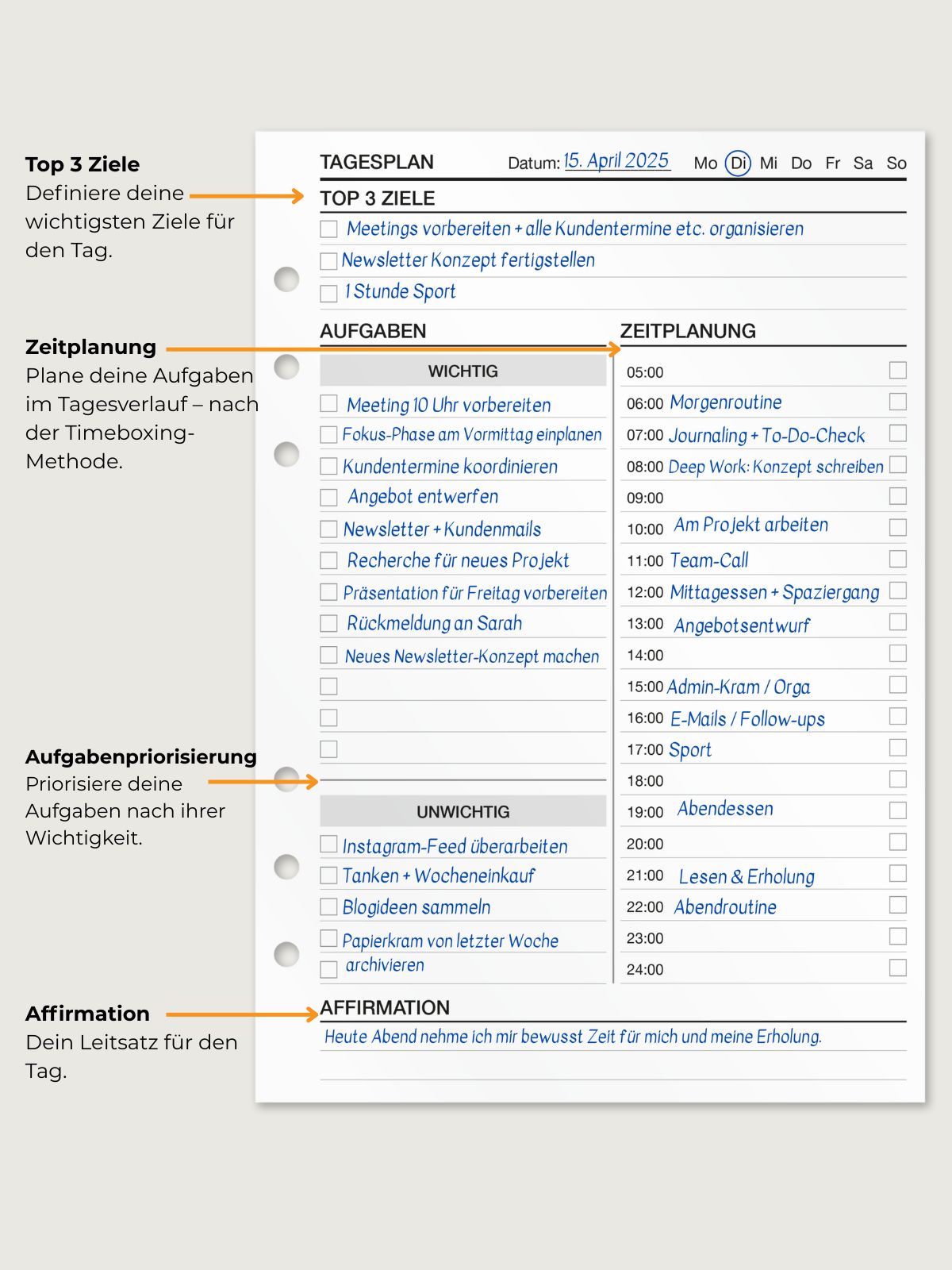 Nutze die bewährte Timeboxing-Methode, um deinen Tag zur organisieren. Priorisiere zunächst nach wichtigen & unwichtigen Aufgaben und verteile diese danach gezielt auf Zeitblöcke, um fokussiert und produktiv zu arbeiten. Perfekt für alle, die ihre Zeit optimal nutzen möchten.